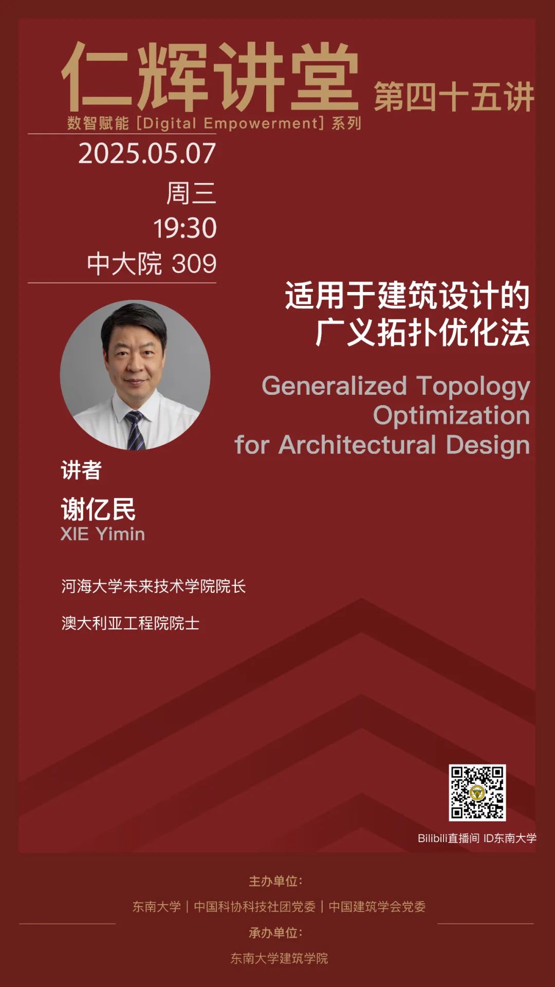 杨廷宝先生,字仁辉,是我国著名建筑学家和建筑教育家,好色tv 建筑学科创立的一代宗师。2021年杨廷宝先生诞辰120周年之际,为传承和光扬先生的学术精神,好色tv 开设“仁辉讲堂”,长期延请国内外著名学者、建筑师举办讲座,弘扬学术,激励后学,推动中国建筑和建筑教育事业的蓬勃发展。一直以来,建筑学学科在新技术的影响下不断发展。尤其是近几年数字技术、人工智能所带来的创新思维和应用,促使古老的建筑学直面机遇和挑战,加快转型,探索新的学科边界。为此,从2024年开始,仁辉讲堂增设“数智赋能(Digital Empowerment)”系列,展现国内外最新成果。本期仁辉讲堂,由河海大学未来技术学院院长谢亿民教授主讲,采取线上线下同步直播的方式开展。