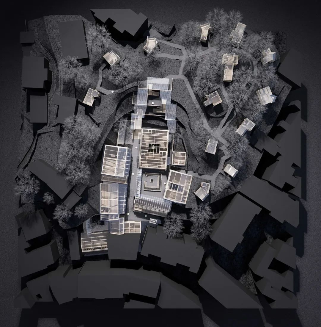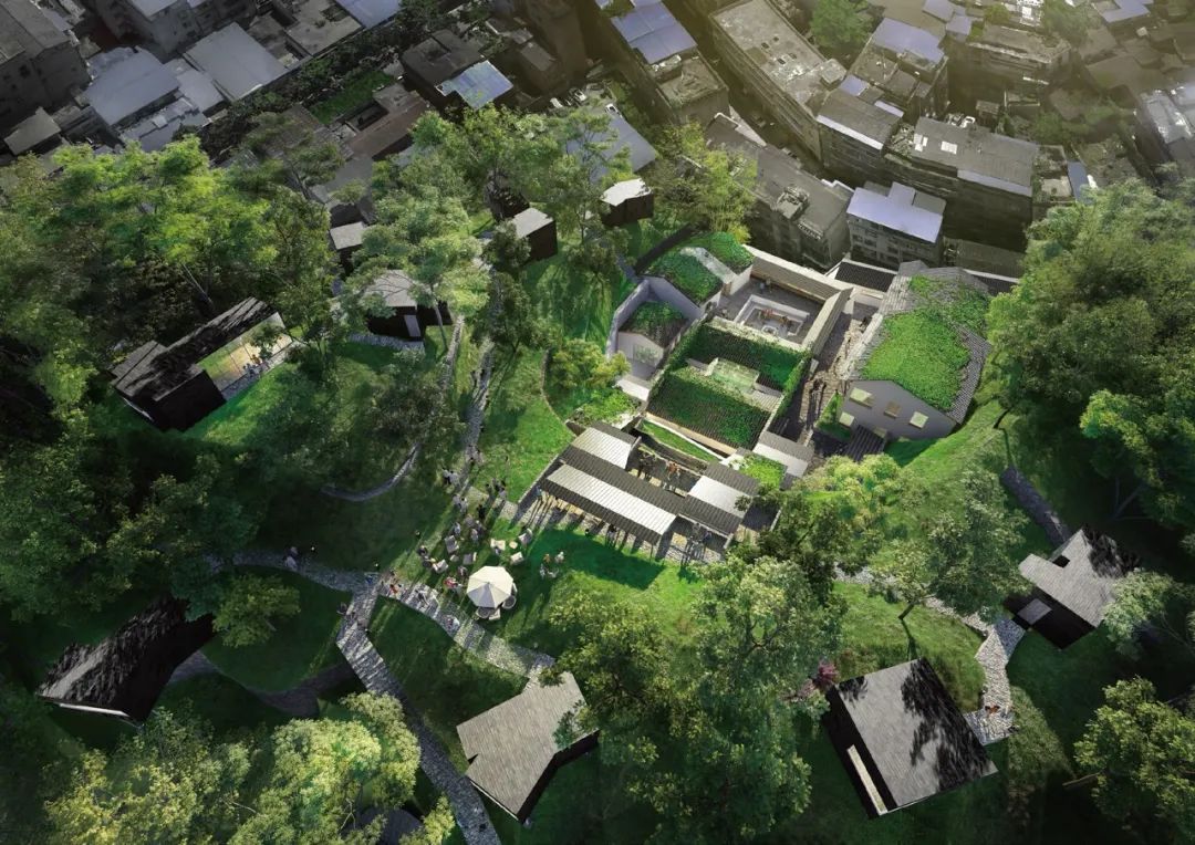 项目位于二战时期湖北省邮政总局旧址,历史建筑与山地景观有机共存,浓缩了古城特有的风貌,是体验当地自然与人文特色的绝佳所在。“微缩恩施”将古城街道肌理、建筑风貌、传统文化和民生智慧融入酒店设计,并植入多朝向、多户型木屋作为“古城取景框”,让酒店化身历史记忆的容器,将被遗弃的历史场域转化为激活古城记忆的触媒,实现“此时此地”与历史时空的叠合。