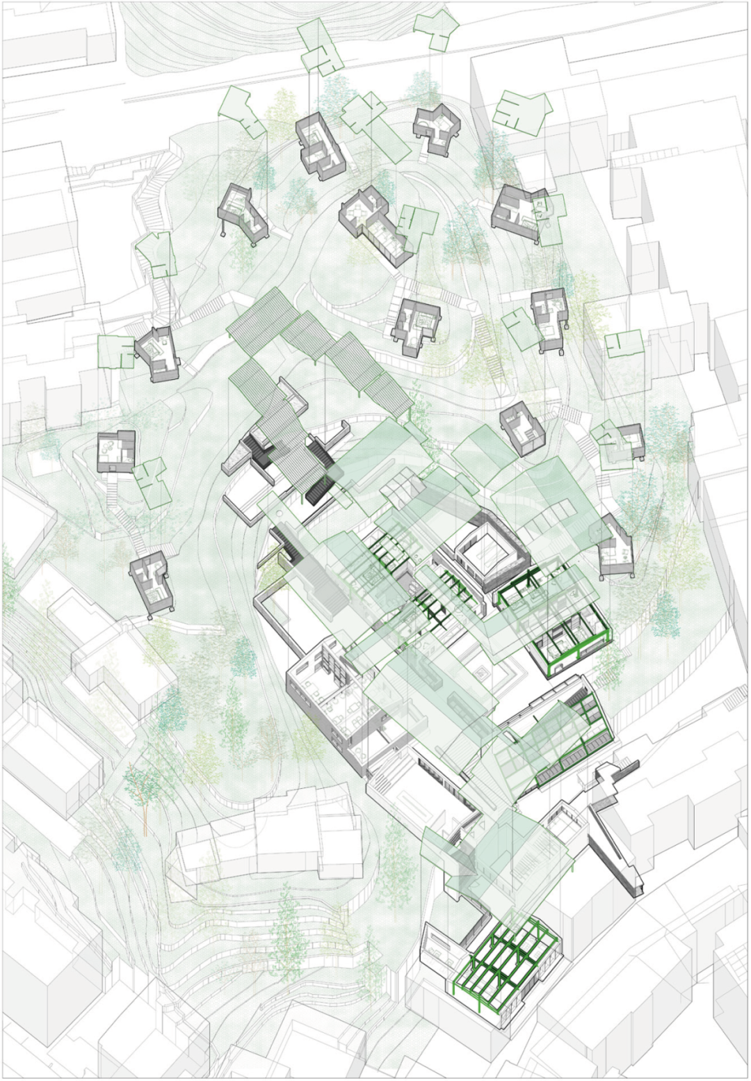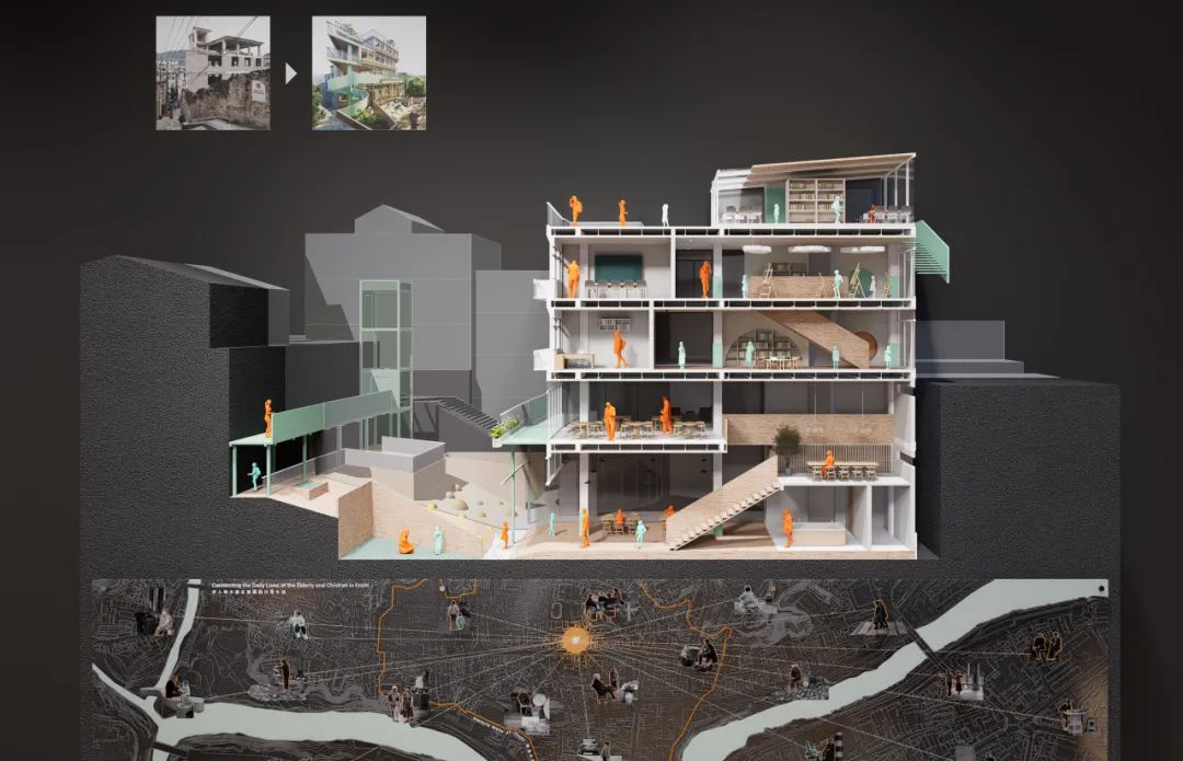 古城里大量年轻人外出务工,老人与儿童缺少陪伴。设计将古城中心的一栋烂尾楼改造为老幼复合托养所,让老人与小孩相互依伴,满足彼此精神需求。根据老幼的行为特点设计功能,并结合地形、防噪、采光等因素优化空间。该地从往昔废弃、抗拒的姿态,转变为和融开放的社区乐园。