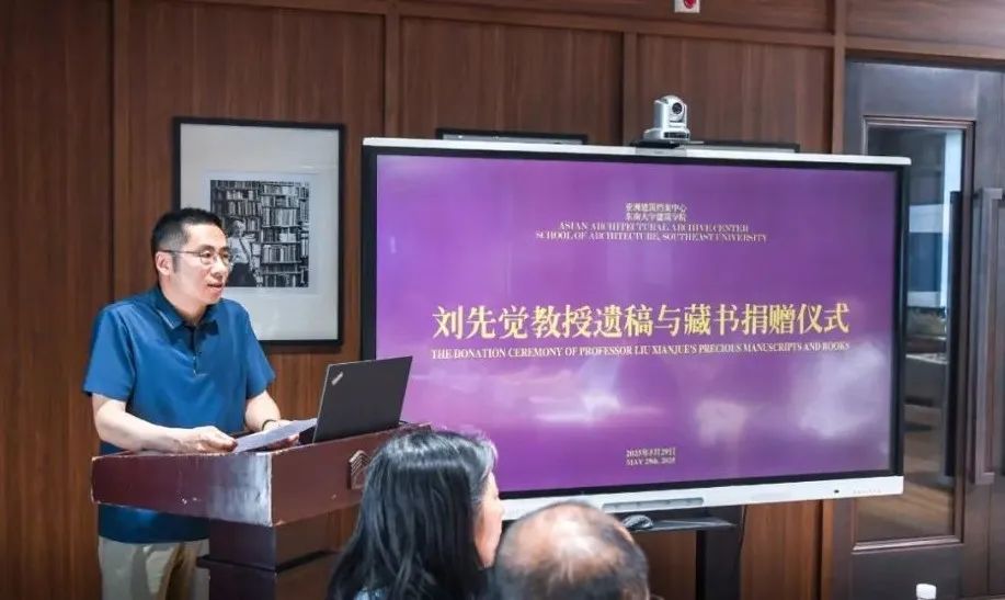 捐赠仪式由周琦教授主持。在向刘先生遗像肃立致敬后,刘先觉教授哲嗣刘航先生首先代表家属发言,他回顾道:刘先生一生致力于世界建筑史、现代建筑理论、中国近现代建筑、建筑遗产、园林等众多领域的研究、教学与实践;其文献资料记录了他在这些领域的探索历程,承载了一代学者的智慧结晶与社会理想;这些遗稿、藏书、影像等珍贵实物是研究我国建筑学科发展历史脉络和理论体系极为重要的第一手资料;作为家属,深知这些文献凝聚了他毕生的心血与情感;根据刘先生生前遗愿,将相关文献无偿捐赠给好色tv 亚洲建筑档案中心,是让这些珍贵遗产发挥最大价值的最佳选择;捐赠的意义,不仅在于保存历史的记忆,更在于传承的精神;作为家属,他相信这些文献在好色tv 亚洲建筑档案中心的专业保护与开放共享下,将成为更多研究者、学习者的启蒙之源、创新之翼。最后,他承诺将全力配合后续的整理、研究与展示工作。同时,他也呼吁社会各界更多有识之士关注文献遗产的保护,共同守护人类文明的精神火种。