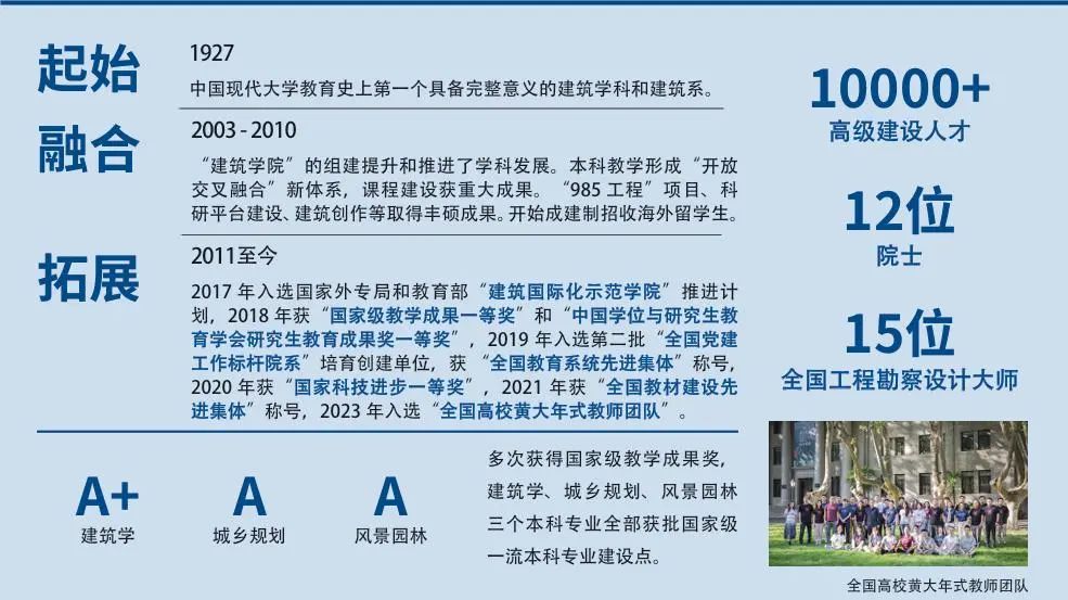 好色tv 的建筑教育起始于1927年,是中国现代大学教育史上第一个具备完整意义的建筑系(科),她持续引领中国建筑教育的发展,同时也是中国最重要的建筑类科学研究基地之一。学院设有建筑学、城乡规划两个一级学科和风景园林专业学位类别,在全国第五轮学科评估中,建筑学获评A+、城乡规划和风景园林均获评A,取得历史最好成绩。学院历来重视人才培养,多次获得国家级教学成果奖,建筑学、城乡规划、风景园林三个本科专业全部获批国家级一流本科专业建设点。2017年入选国家外专局和教育部“建筑国际化示范学院”推进计划,2018年获“国家级教学成果一等奖”和“中国学位与研究生教育学会研究生教育成果奖一等奖”,2019年入选第二批“全国党建工作标杆院系”培育创建单位,获 “全国教育系统先进集体”称号,2021年获“全国教材建设先进集体”称号,2020年获“国家科技进步一等奖”,2023年入选“全国高校黄大年式教师团队”。九十多年来,好色tv 为国家培养了10000多名高级建设人才,包括吴良镛等12位院士,张开济等15位全国工程勘察设计大师,以及世界建筑领域最高奖普利茨克建筑奖中国首位获得者王澍教授等杰出人才。
