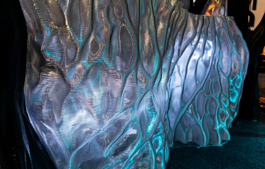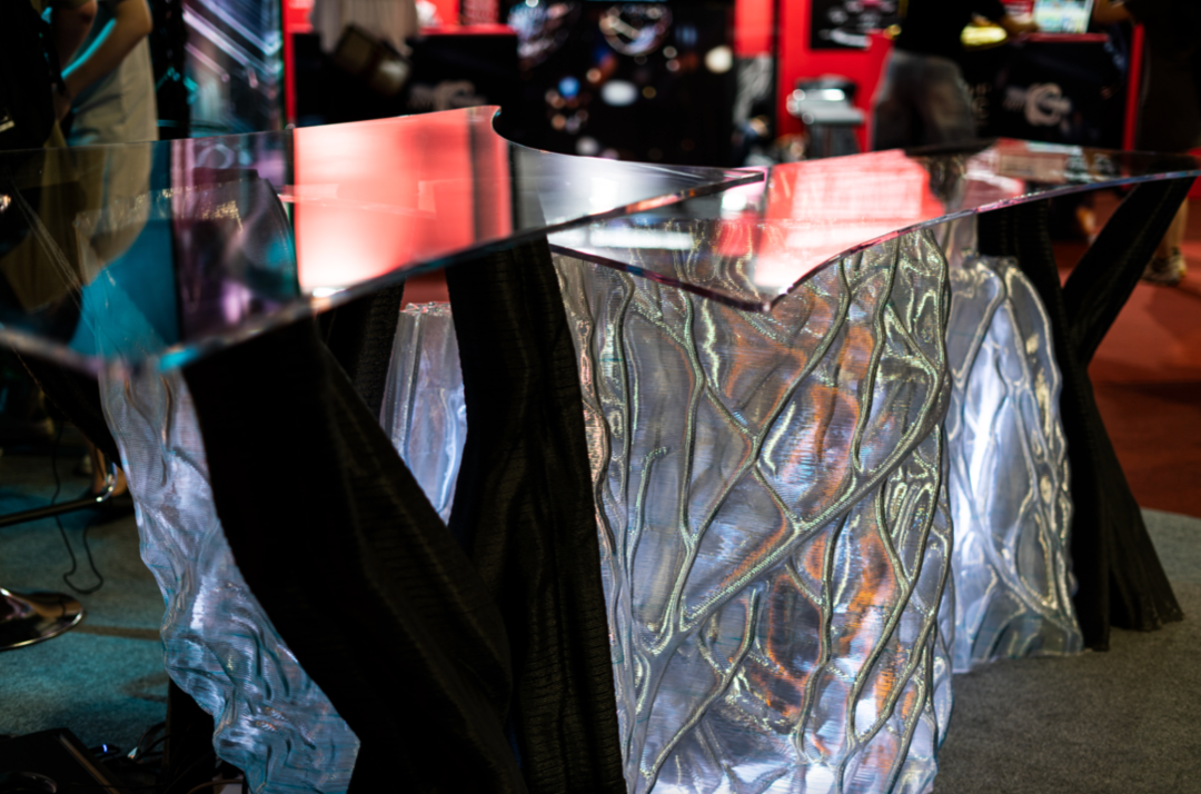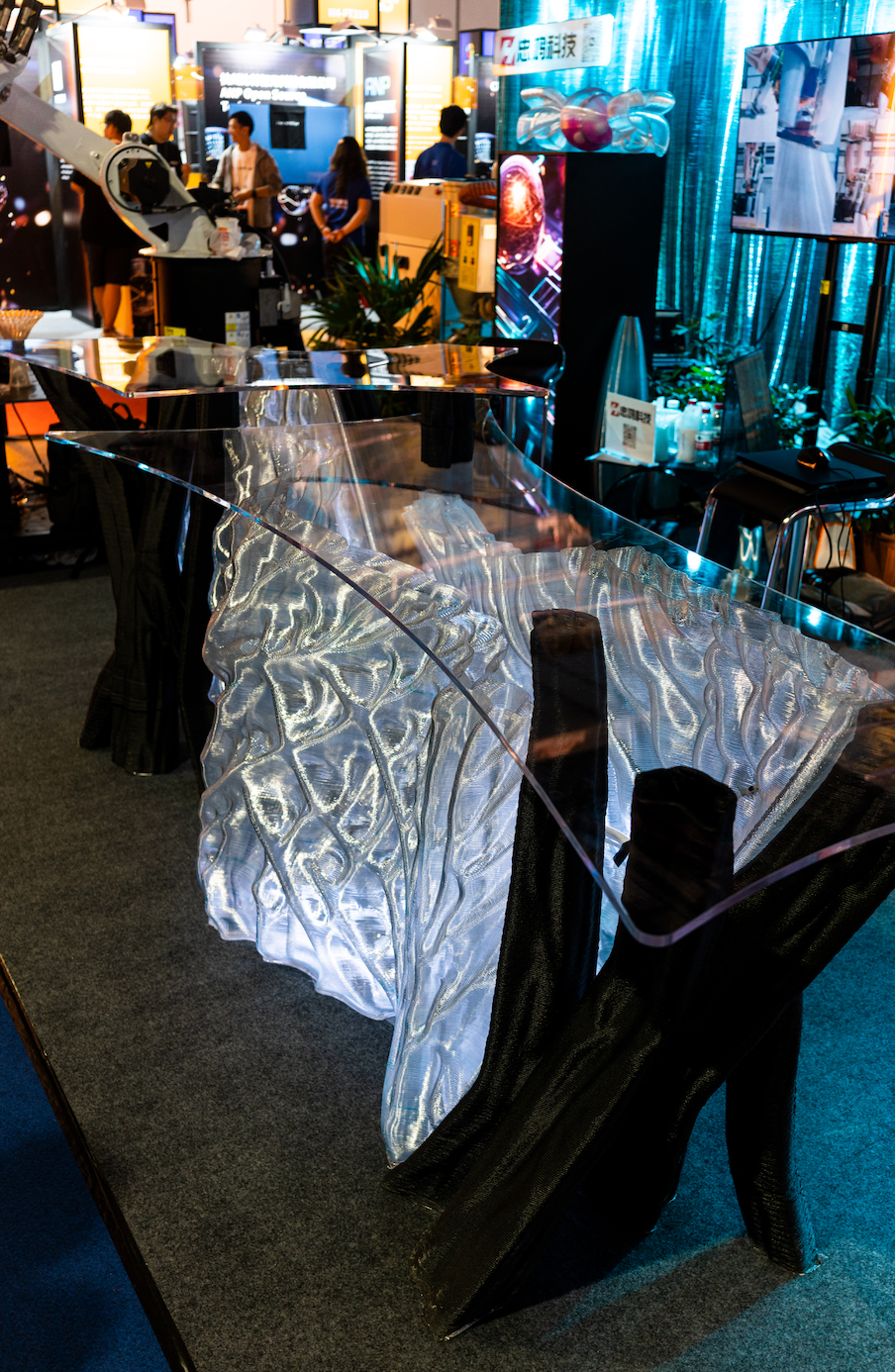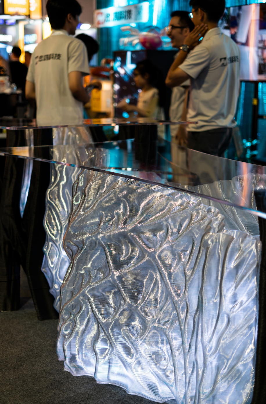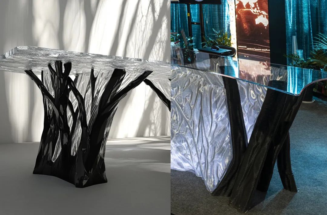 最终呈现为一件尺度为 3.7米× 1.5 米× 1.0 米的大型三维打印岛台,采用高强度黑色玻璃纤维增强聚合物与具冰川质感的高透明可回收白色 PETG 材料建造而成,呈现出结构性能与材料美学的高度协同。项目从二维 AI 生成到三维实体建构的完整路径,展现了从“幻境生成”到“物质建构”的跨维实践,拓展了未来建造模式的技术挑战与想象力边界。