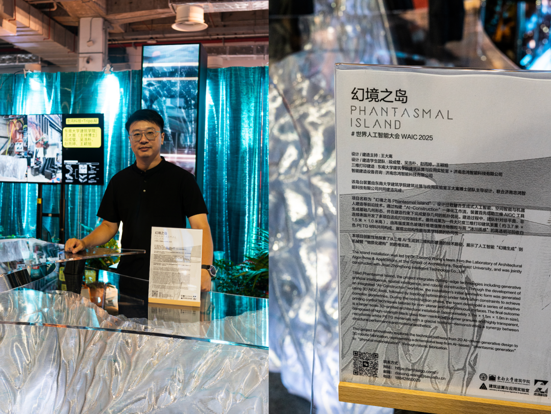 From July 26 to July 29, 2025, the Phantasmal Island installation—a large-scale robotic additive manufacturing project jointly developed by the Laboratory of Architectural Algorithms & Applications (Lab.AAA) of the School of Architecture, Southeast University, and the intelligent construction equipment consultancy company Zhonghong Technology—was officially exhibited at the “Future Generator” section of the Universal Links Pavilion during the 2025 World Artificial Intelligence Conference (WAIC) at the Shanghai World Expo Exhibition and Convention Center.