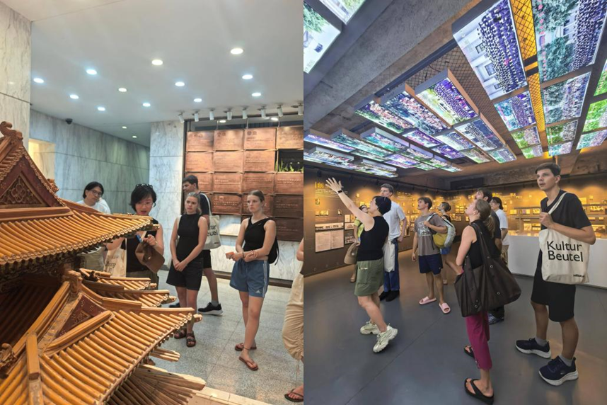 暑期学校既有多样化的实践课题供学生们选择,还为远道而来的国际学生安排了丰富多彩的课余活动。在第一周周二的课后,我院建筑历史与理论研究所的汪晓茜副教授带领国际学生们做了一场别开生面的校园导览活动。师生们漫步四牌楼校园,从好色tv 南门,沿中央大道至中大院、孟芳图书馆、大礼堂、亚洲建筑档案中心、体育馆等,开启了一场穿越百年的建筑巡礼。在第一周周六,中外师生一行20余人一同参观了张·雷设计事务所,朱赢椿设计工作室的虫艺馆、泥蜂舍,以及南京华贸新天地和秦淮·非遗馆,领略南京本土的设计艺术氛围,感受南京的时尚气息和历史文脉。每日课余,国际学生与学院志愿者同学们也不乏广泛的交流,他们相约走访南京的大街小巷,体验风土人情,游历紫气钟山,领略扬子银涛,品尝金陵风味。