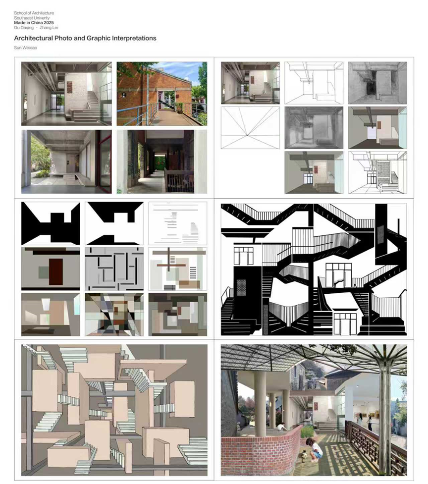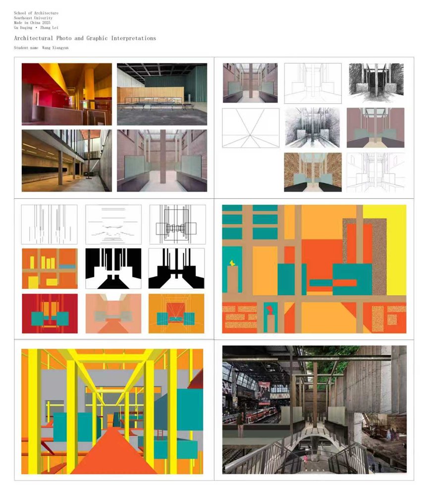 建筑照片的作用是记录建筑的场景,是建筑师表达设计意图的重要手段。但是照片本身也是一件“作品”,有其自身的构成逻辑。该课题以一幅建筑照片为起点,通过四种不同的图绘来建立对该照片的认识。首先是对建筑内涵的解读:要素、空间、光线、材质和图案等的图解阅读;其次是画面构图的解读和抽象构图:点线面和画面构图;然后是透视作为空间想象的手段发展成一幅基本构成要素的空间构成,最后通过照片蒙太奇将原照片进行转换,创造出一个新的场景。