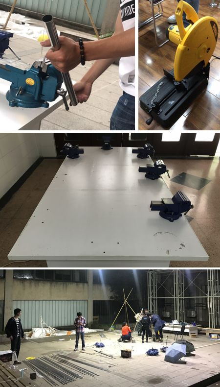 The construction of Pavilion is mainly divided into four basic steps:purchasing materials, producing components, making hyperboloids and finally assembling. The main material aluminum tube is totally 2000 meters long and was purchased in Shanghai. 1mm thick aluminum plate was bought in Nanjing. Most of the rest of the materials were purchased online. Pavilion mainly consists of two standard components and one non-standard component. Among them, Among them, there are 1700 pieces of standard component aluminum pipe clips and 1000 pieces of standard swivel joints. In order to achieve rapid production, Zhang Junjun and Xiang Yiming designed and manufactured new tools to carry out standardization work according to the experience of ETH, and achieved high efficiency, high speed and high quality through the integration work of Xiang Yiming, Zhang Min and Ni Jiaxin. More than 800 non-standard length straight aluminum tubes were noted by undergraduates and cut by Wang Guanjun. In the process of cutting, Wang Guanjun found a good way to cut quickly and economically. The production of hyperboloids was done in groups of undergraduates. In an average of one hour a hyperboloid was completed with two people of each group. The final overall assembly was completed by the team as a whole under the leadership of Dr. Cao Ting and Dr. Zhang Junjun. The assembly was carried out from both ends to the middle and the closure was carried out at the largest arch. It was spectacular and the team realized their original goal.