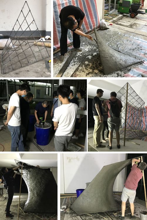 Compared with Pavilion consisting of 40 hyperboloids, the concrete thin shell structure is composed of only 6 surfaces, but its construction process was much more difficult. We need to weld the steel frame first, then cover it with a wire mesh. Since the hyperboloid is a curved surface in two directions, it is very difficult to control when wrapping the wire mesh. We have visited the building materials market many times before we found a suitable wire mesh. The most difficult and most interesting thing was the spaying and molding of concrete. First of all, we need to mix the right proportion of fiber concrete. With the help of the team of Professor Zhang Yunsheng from the School of Materials, after many experiments, we finally got a relatively ideal concrete mix proportion. In addition, we also tried the concrete spaying machine for the first time. Although the result was not fully satisfying, the attempt was positive itself. Professor Zhang Hong from the School of Architecture in Southeast University has been working on architecture real-world construction, providing advantages for the real construction of this exhibition.