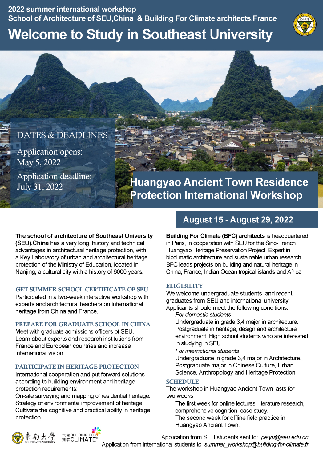 The workshop in Huangyao Ancient Town includes lectures online and practice offline. In the form of fast-paced teaching, the workshop enables students to pay attention to the comfort of ancient folk houses, simulate international cooperation and put forward comprehensive plans according to the building environment and heritage protection requirements of folk houses, and cultivate the cognitive and practical ability of the new generation of Chinese and European architectural students in heritage protection.The workshop will be held from 15th August to 29th August, 2022. Students who have completed the course can get Summer School Certificate of SEU. Welcome students interested in this course to sign up!