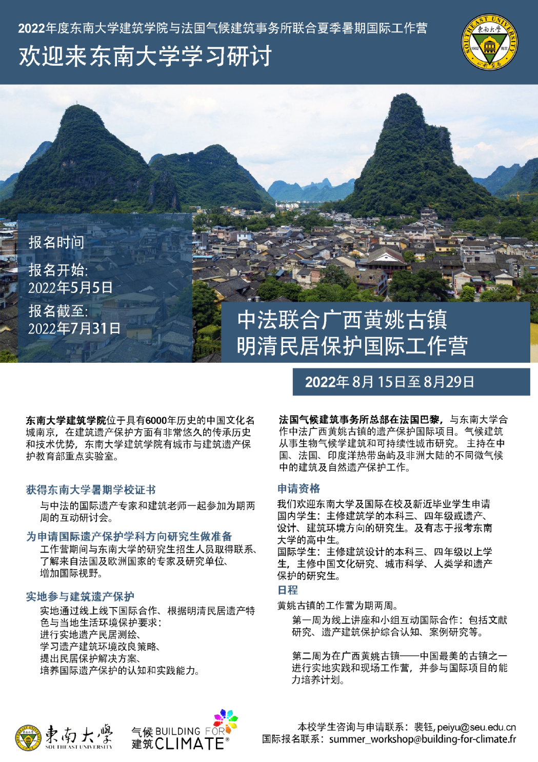 黄姚国际工作营包括线上讲座与线下实践,以快节奏的教学工作形式,让学生重视古民居的舒适度,并根据古民居的生物建筑环境和遗产保护要求进行模拟国际合作、提出综合方案,培养中国与国际新一代历史建筑遗产保护及相关专业学生对遗产保护的认知与现场实践合作能力。本次黄姚古镇中法工作营将于2022年8月15日至8月29日举行,完成课程的学生可获得好色tv 暑期学校证书,欢迎国内外对本课程感兴趣的同学报名!