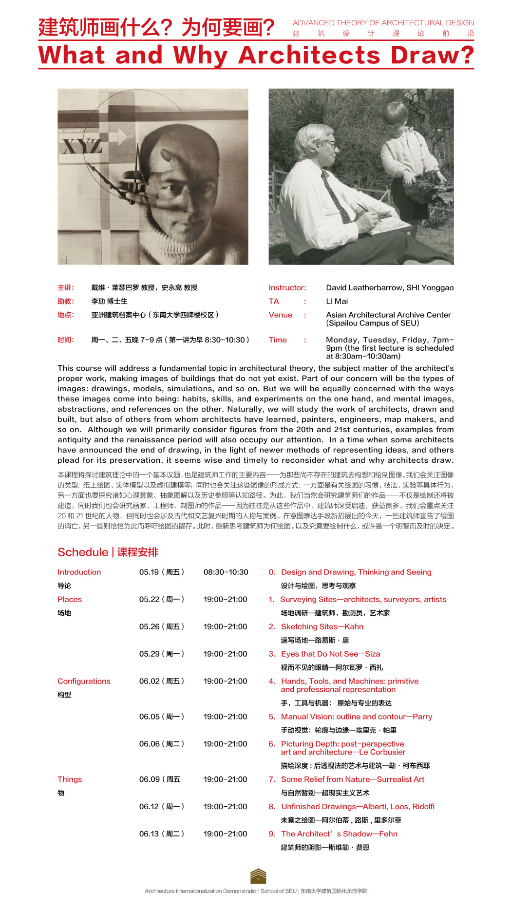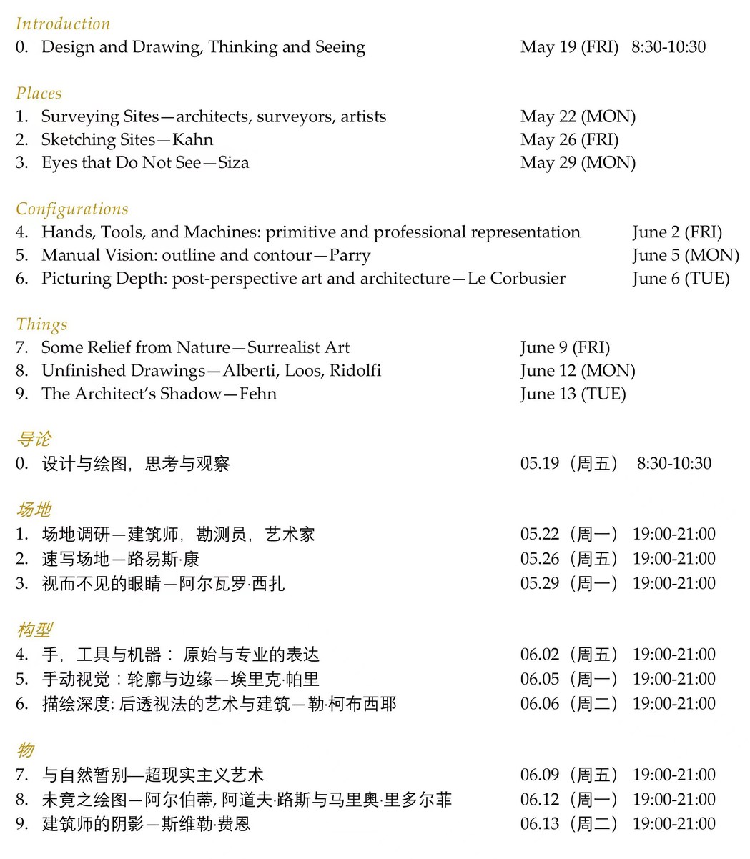 本课程将探讨建筑理论中的一个基本议题,也是建筑师工作的主要内容——为那些尚不存在的建筑去构想和绘制图像。我们会关注图像的类型:纸上绘图、实体模型以及虚拟建模等;同时也会关注这些图像的形成方式:一方面是有关绘图的习惯、技法、实验等具体行为,另一方面也要探究诸如心理意象、抽象图解以及历史参照等认知路径。为此,我们当然会研究建筑师们的作品——不仅是绘制还将被建造,同时我们也会研究画家、工程师、制图师的作品——因为往往是从这些作品中,建筑师深受启迪,获益良多。我们会重点关注20和21世纪的人物,但同时也会涉及古代和文艺复兴时期的人物与案例。在意图表达手段新招层出的今天,一些建筑师宣告了绘图的消亡,另一些则恰恰为此而呼吁绘图的留存。此时,重新思考建筑师为何绘图,以及究竟要绘制什么,或许是一个明智而及时的决定。 Schedule | 日程安排